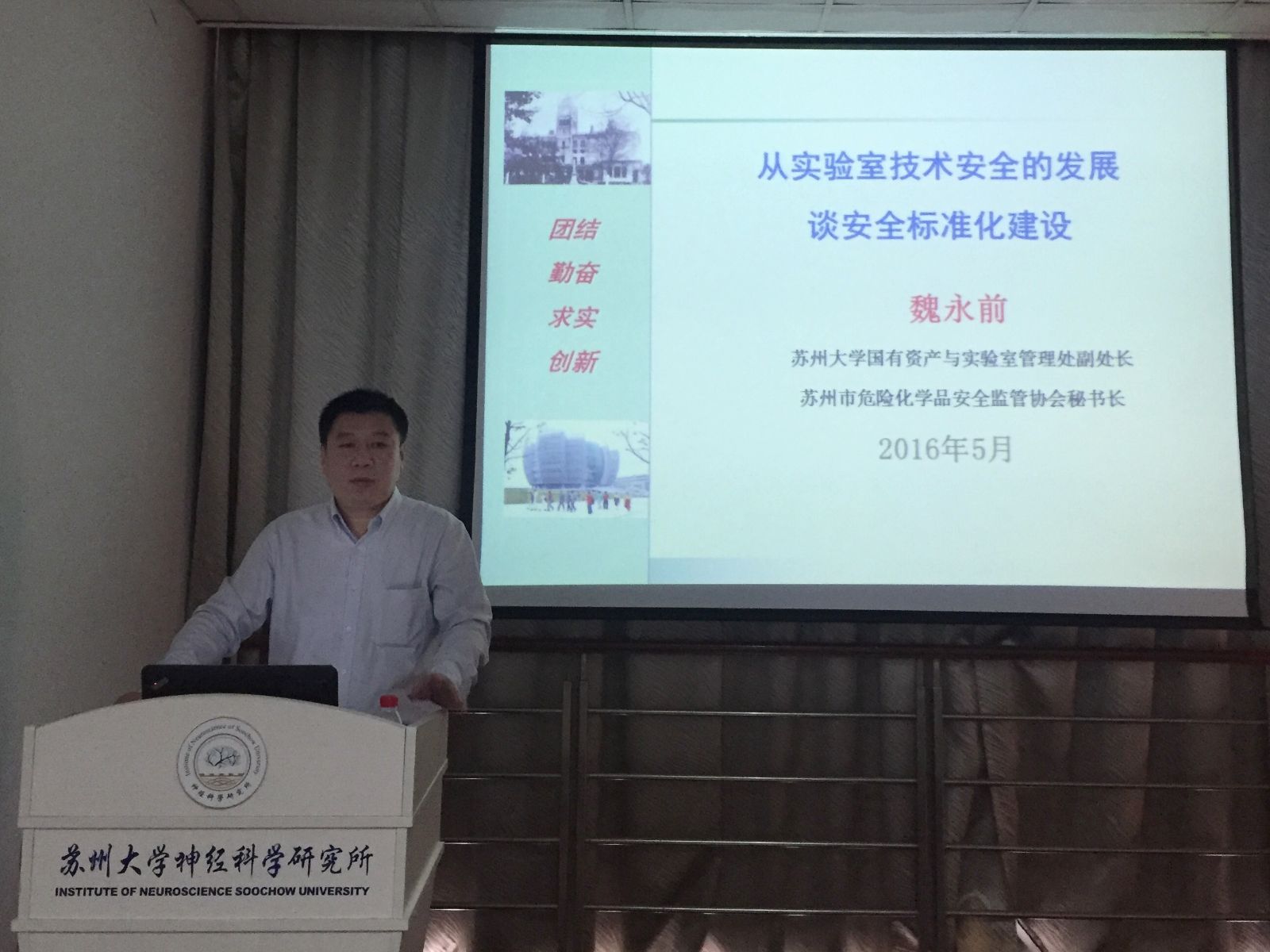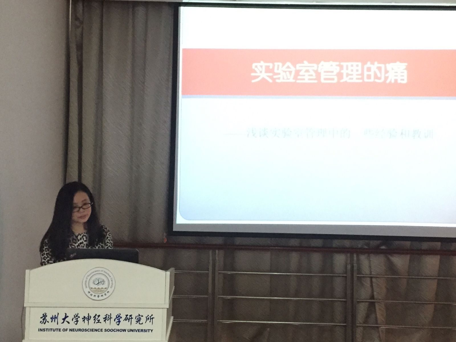 为加强实验室管理和安全意识,2016年5月12日下午,神经科学研究所特邀请中国科学院神经科学研究所实验室主管陆莹瑾老师与苏州大学国有资产与实验室管理处魏永前副处长来我所进行讲座。
