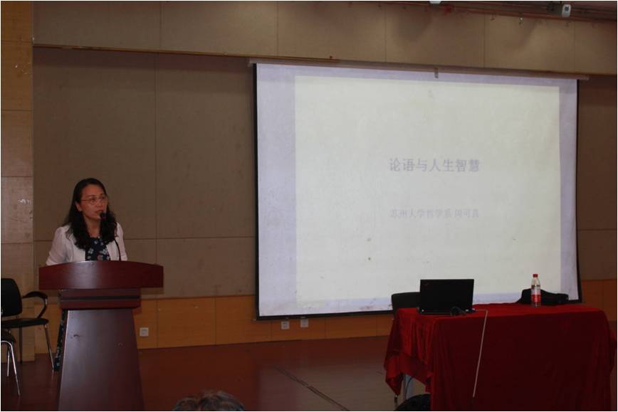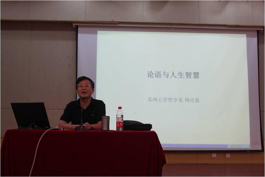 报告主讲人中国社会科学院哲学博士、中国哲学史学会理事、江苏省儒学会副会长、苏州大学政治与公共管理学院周可真教授在一百分钟左右的时间里,用通俗易懂的语言和寓意深刻的故事,生动阐述了《论语》中所包涵的修身、齐家、治国、平天下的道理,提出做人应当具备智、仁、勇兼备的理想人格,通过修己以敬的方法,达到随心所欲不逾矩的至高人生境界。